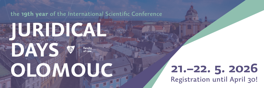 The conference will take place this year from 21st to 22nd May 2026 and in line with its tradition it will take place in two parts. Prominent experts will speak in the introductory plenary section, the second part will take place through thematically focused sections. We believe that this year, which will already be the 19th year of the Juridical Days in Olomouc will be at least as successful as in the previous years and it will once again bring a lively and fruitful scientific debate.