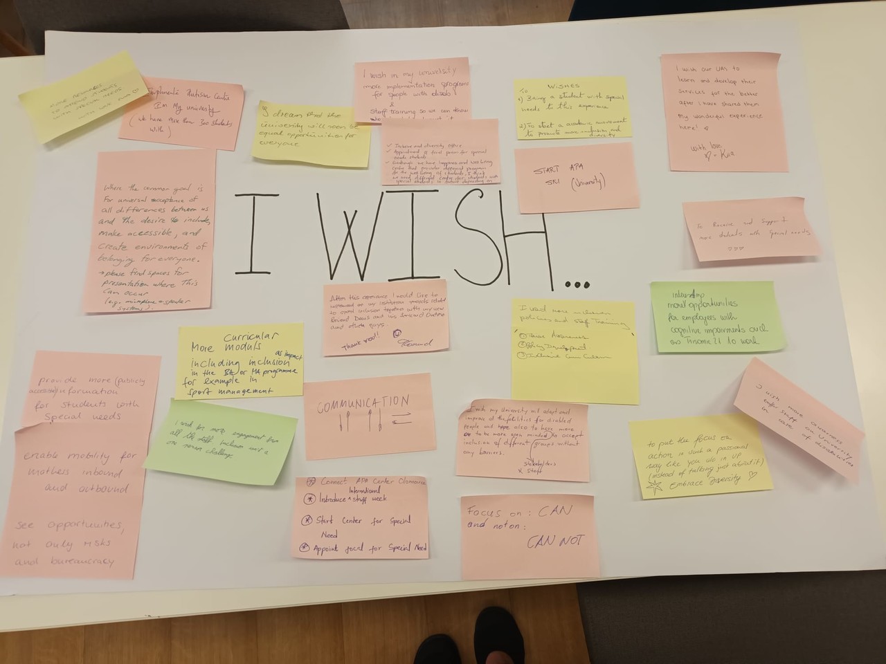 „Po těchto pěti dnech – kdybyste si mohli přát jedinou změnu na své univerzitě v oblasti inkluze, co by to bylo?“ Mezi jejich odpovědi patřilo: větší podpora studentů se specifickými potřebami, zřízení oddělení pro inkluzi a diverzitu, školení zaměstnanců v oblasti inkluze, adaptace infrastruktury a pomůcek pro studenty a zaměstnance se specifickými potřebami větší důraz na to, co je možné, nikoliv nemožné, poskytnutí podpory v oblasti well-beingu a psychického zdraví a mnoho dalšího.