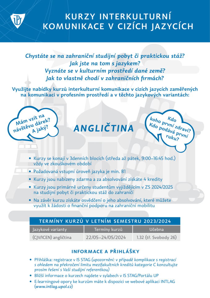 přinášíme Vám aktuální nabídku jazykové a interkulturní přípravy v akademickém roce 2023/2024 určené studentům všech fakult UP (v případě stáží také čerstvým absolventům) vyjíždějícím v ZS 2024/2025 na studijní pobyt či praktickou stáž v rámci programu Erasmus+ nebo jiného dotačního titulu. Tato příprava cílí na rozvoj a získání jazykových a interkulturních dovedností studentů a posílení jejich sociální a kulturní integrace během zahraniční mobility či budoucího profesního uplatnění se v zahraničí.