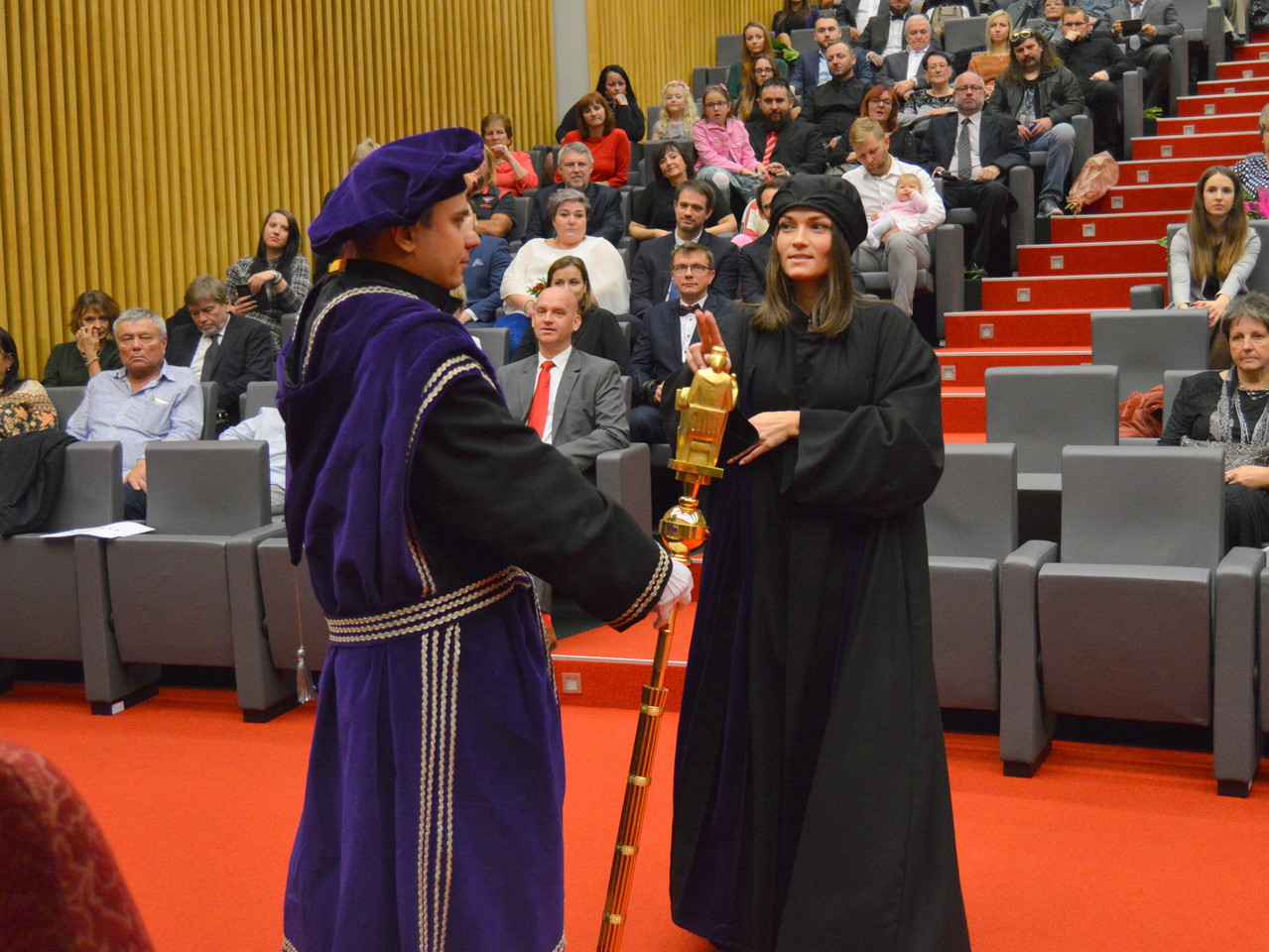 Kvůli rozsáhlé dostavbě právnické fakulty museli absolventi i tentokrát promovat v aule pedagogické fakulty.