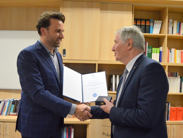 K poděkování se připojil i rektor Michael Kohajda, který Jiřímu Jiráskovi předal bronzovou medaili Za zásluhy o rozvoj Univerzity Palackého a dlouholetý přínos právnické fakultě.