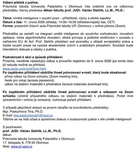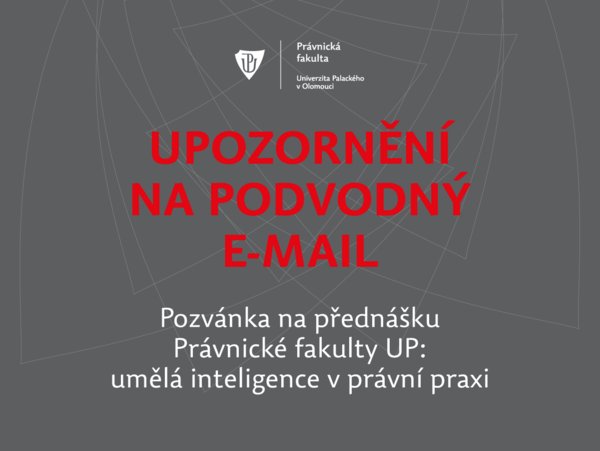 Právnická fakulta Univerzity Palackého v Olomouci upozorňuje na podvodný e-mail (phishing) zneužívající jména jejího děkana profesora Václava Stehlíka. Od e-mailu „Pozvánka na přednášku Právnické fakulty UP: umělá inteligence v soudní praxi“ se děkan distancuje. Fakulta žádnou takovou akci v avizovaný den 11.02.2026 nepořádá.